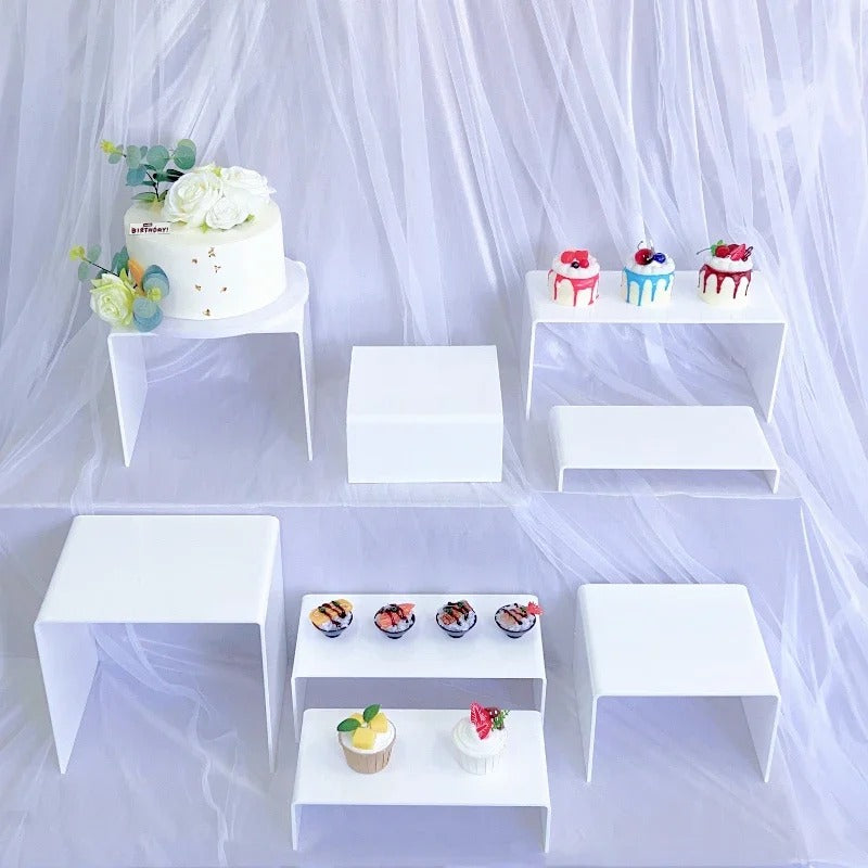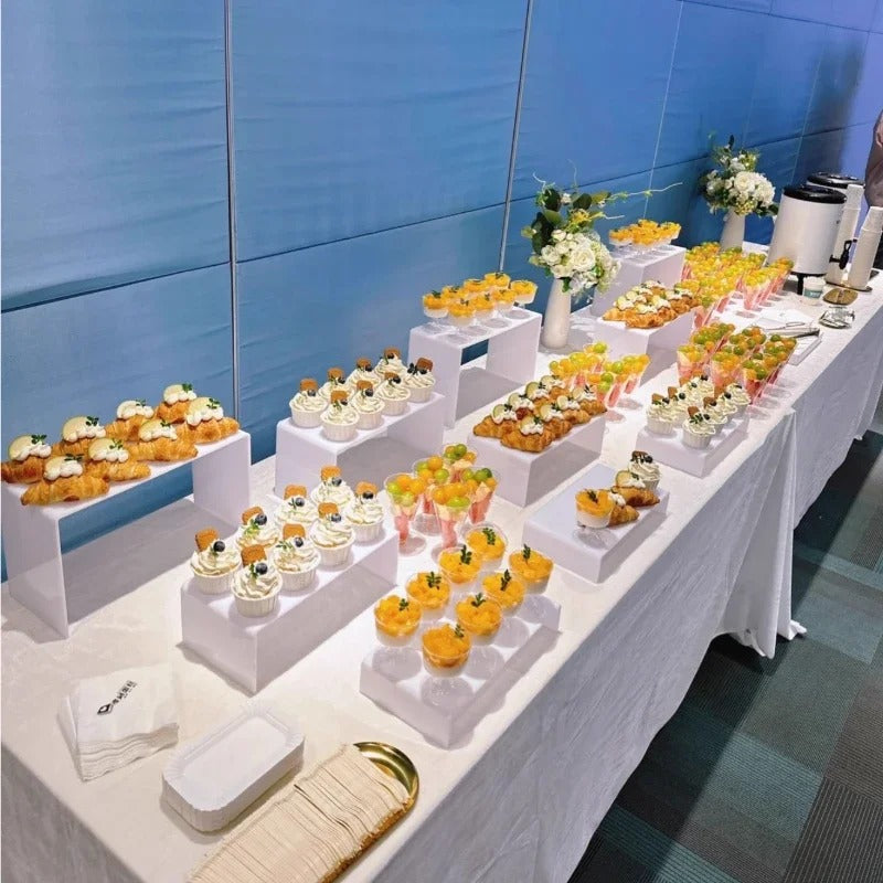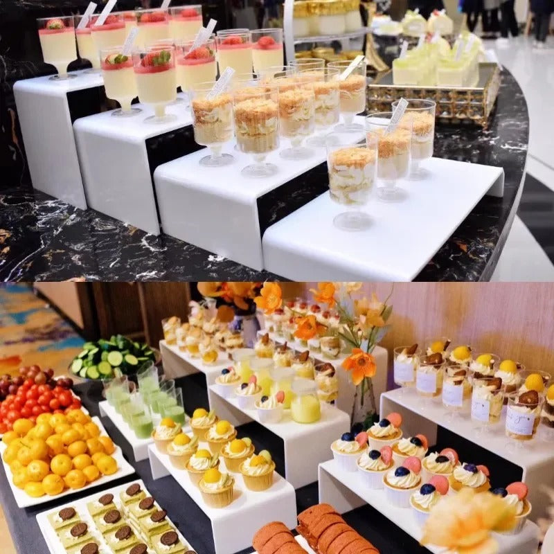 Leur structure en acrylique blanc s’adapte à toutes les thématiques : du mariage élégant à la réception d’entreprise moderne, en passant par les buffets d’anniversaire ou les salons professionnels. Mettez vos produits en avant tout en gardant un rendu propre, net et lumineux. Ces supports sont également parfaits pour les présentations de cupcakes, verrines, bijoux, objets déco ou cosmétiques.