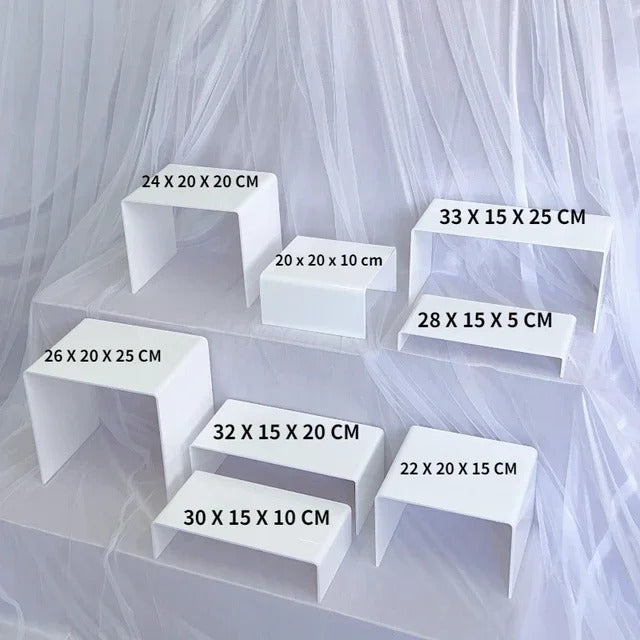 Conçus en acrylique blanc brillant de haute qualité, ces supports allient légèreté, solidité et élégance. Leur surface lisse et leur finition brillante apportent une touche moderne et minimaliste à vos présentations. Leur forme en “U inversé” permet de jouer sur les hauteurs et les volumes, offrant ainsi un rendu visuel harmonieux et attrayant.