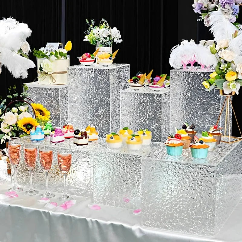 Ce lot de présentoirs en acrylique effet glaçon comprend plusieurs cubes de tailles variées, permettant de créer une mise en scène en hauteur harmonieuse et équilibrée. Disposez vos gâteaux, coupes de fruits, flûtes à champagne, décorations florales ou objets décoratifs pour un effet visuel époustouflant.